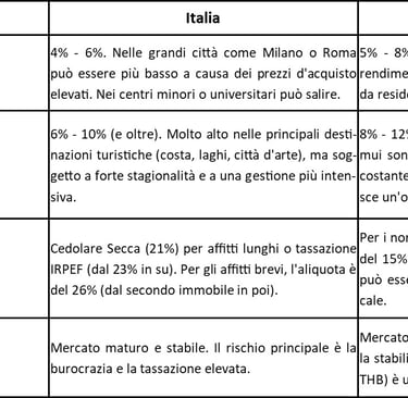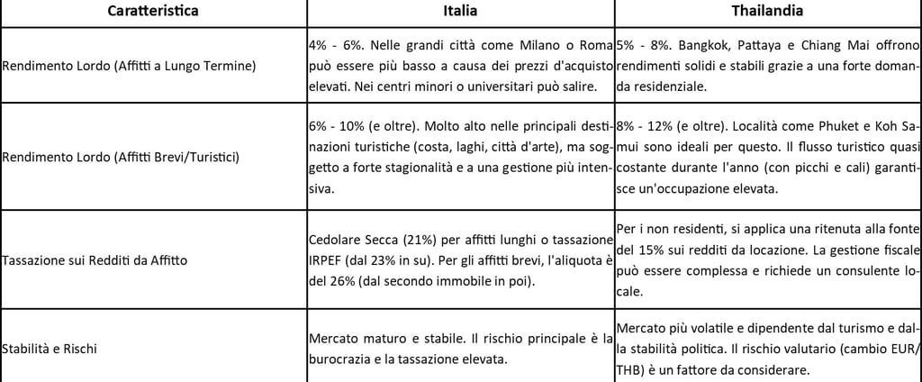 La Thailandia offre potenzialmente rendimenti da affitto più elevati, sia per locazioni a lungo termine che, soprattutto, per quelle turistiche. Tuttavia, l'Italia rappresenta un mercato più stabile e "familiare" per un investitore europeo, con minori rischi legati a valuta e instabilità politica.