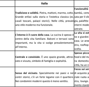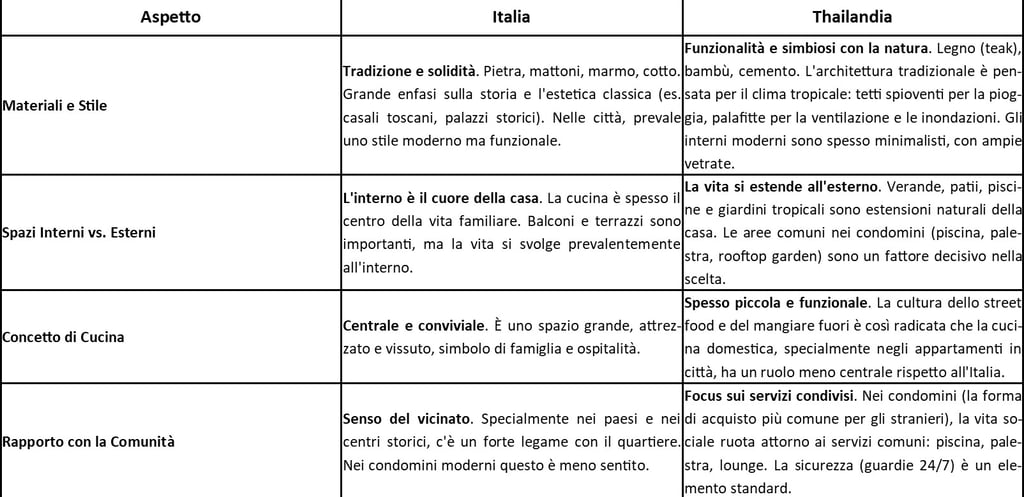 Lo stile abitativo italiano è radicato nella storia, nella famiglia e nella convivialità interna. Quello thailandese è plasmato dal clima, dalla natura e da uno stile di vita che fonde spazi privati e servizi comuni, con una forte proiezione verso l'esterno.