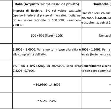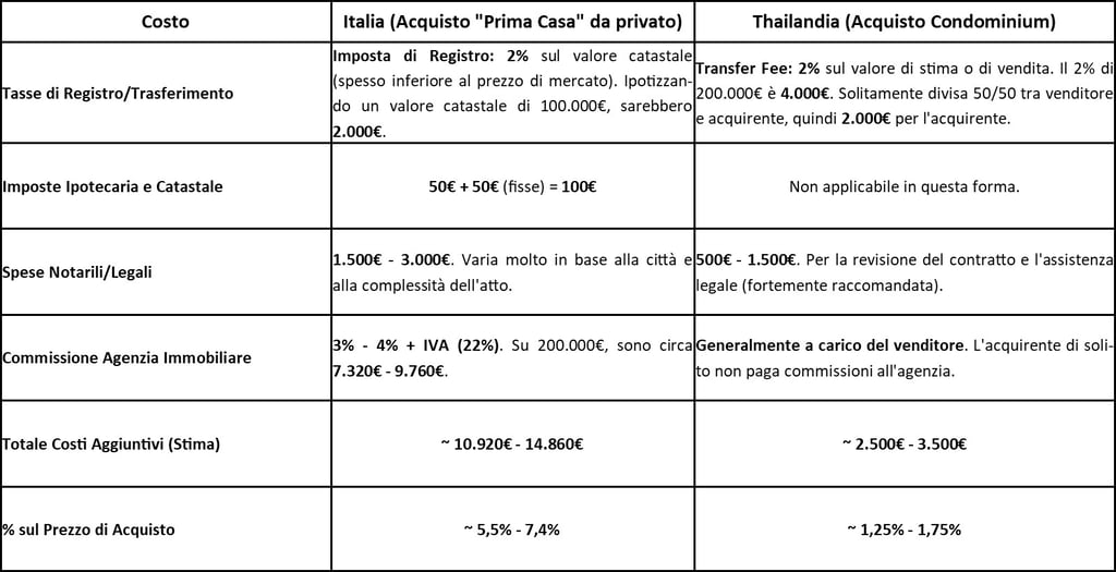 L'acquisto di un immobile in Thailandia è significativamente meno costoso in termini di costi accessori, principalmente perché le commissioni di agenzia sono a carico del venditore e le tasse di trasferimento sono più contenute e spesso condivise.