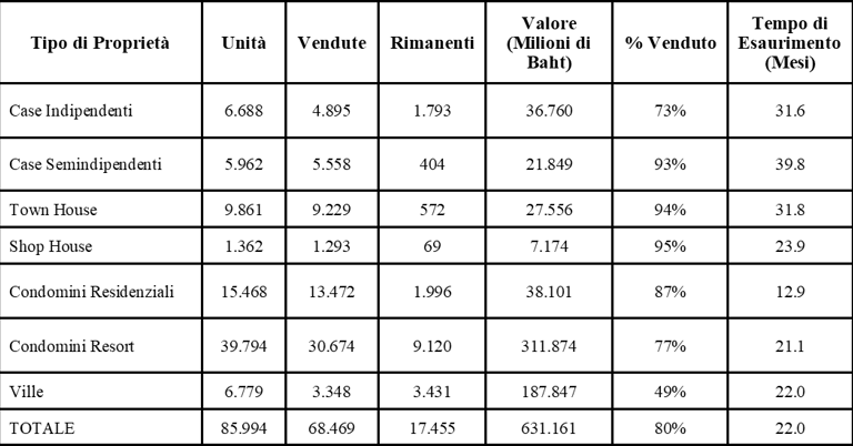 È interessante notare come i segmenti delle Town House e delle Shop House mostrino tassi di vendita eccezionalmente alti (94% e 95% rispettivamente), indicando una forte domanda per soluzioni abitative e commerciali a prezzi più accessibili. I Condomini Resort, pur avendo il maggior numero di unità totali, mantengono un solido 77% di venduto, riflettendo l'attrattiva di Phuket come destinazione turistica e di investimento per le seconde case.